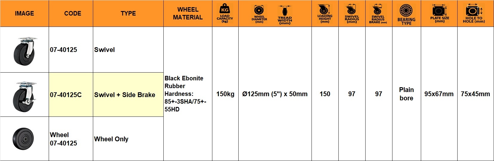 Ø125mm (5") Black Ebonite Rubber Wheel Castors | 150KG capacity per castor